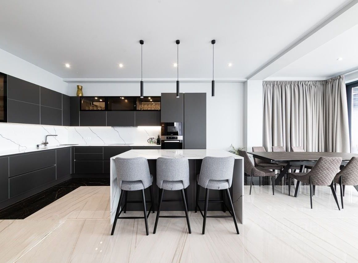 — Кухонный остров с современной кухонной группой и столовой зоной, объединяющий функциональность и эстетику.