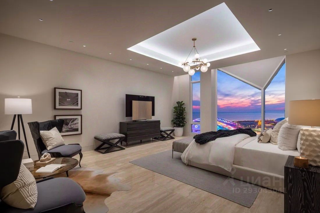 Пентхаус площадью 210 м² распланирован в 3 спальни, каждая спальня оборудована собственной гардеробной и санузлом, просторную кухню гостиную с островом для повода и обеденной зоной, кабинет с великолепным видом на Олимпийский парк и основная большая гардеробная зона. Изюминкой данного апартамента является просторная терраса площадью 30 м² с ротанговой мебелью и великолепным видом. Как вы можете наблюдать, из каждого окна открывается одни из лучших видовых характеристик в Олимпийском парке.