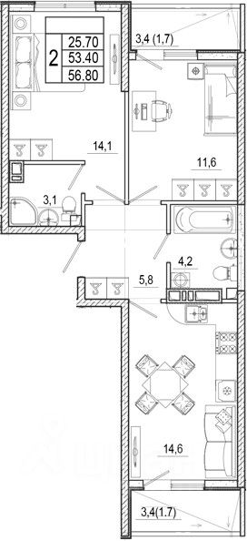 Общая площадь56,8 м2