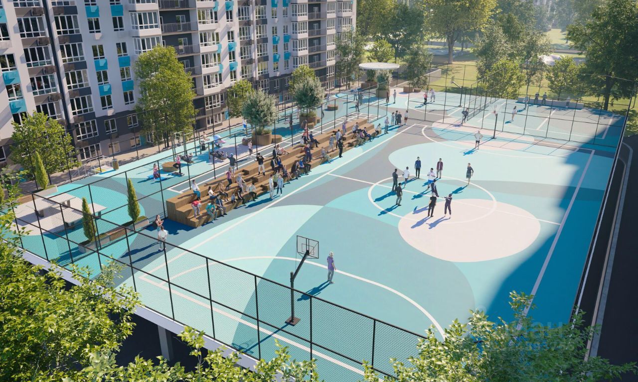 Двор комплекса закрыт от автомобилей и случайных прохожих. Для автовладельцев предусмотрен двухуровневый подземный паркинг на 650 мест. По всему периметру двора размещены видеокамеры. Внутренний двор благоустроен: предусмотрены пешеходные дорожки, скамейки и деревянные мини-беседки с розетками. Также спроектированы детские игровые площадки, уличные тренажеры и спортивная площадка для командных игр.