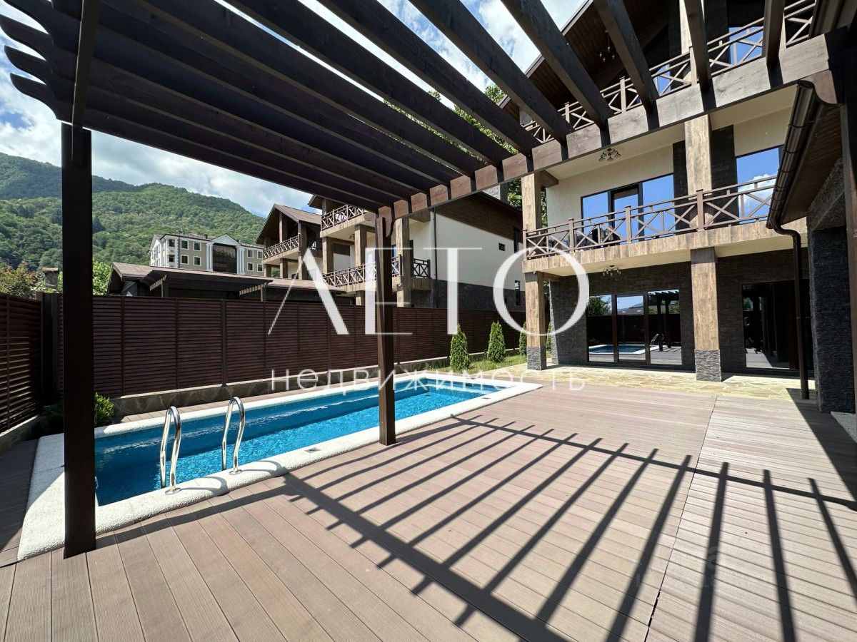 Прекрасный вид на горные вершины, бассейн, баня, просторная парковка для автомобилей.
