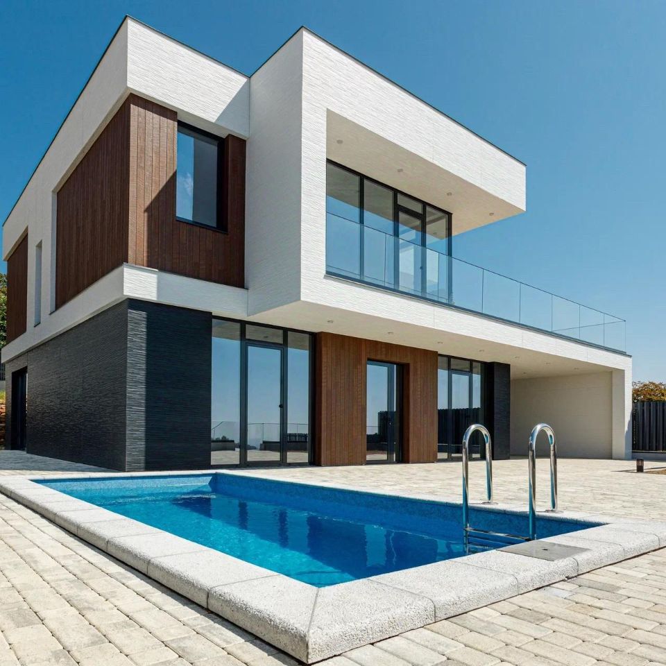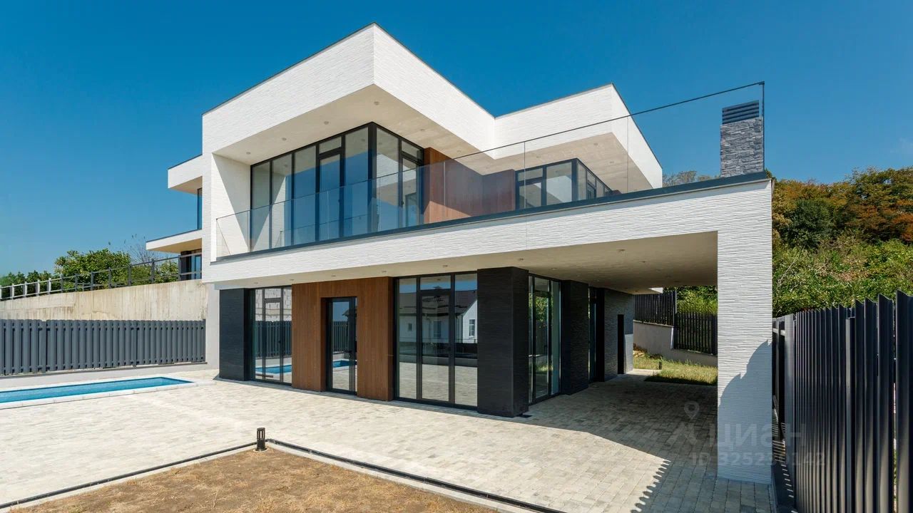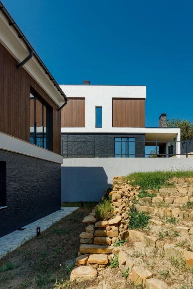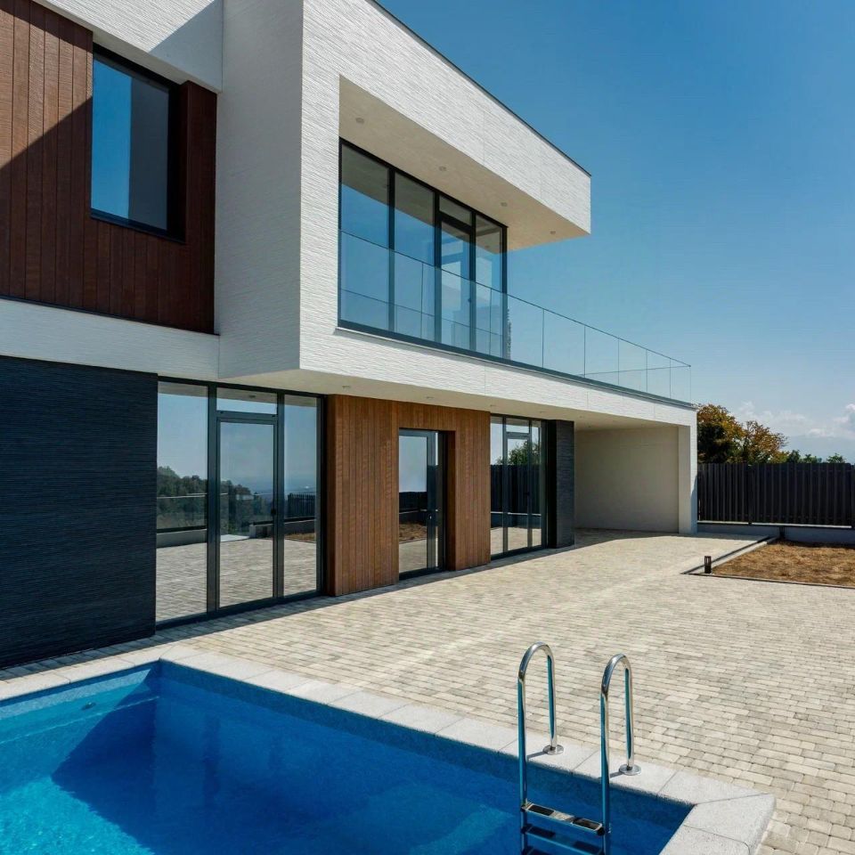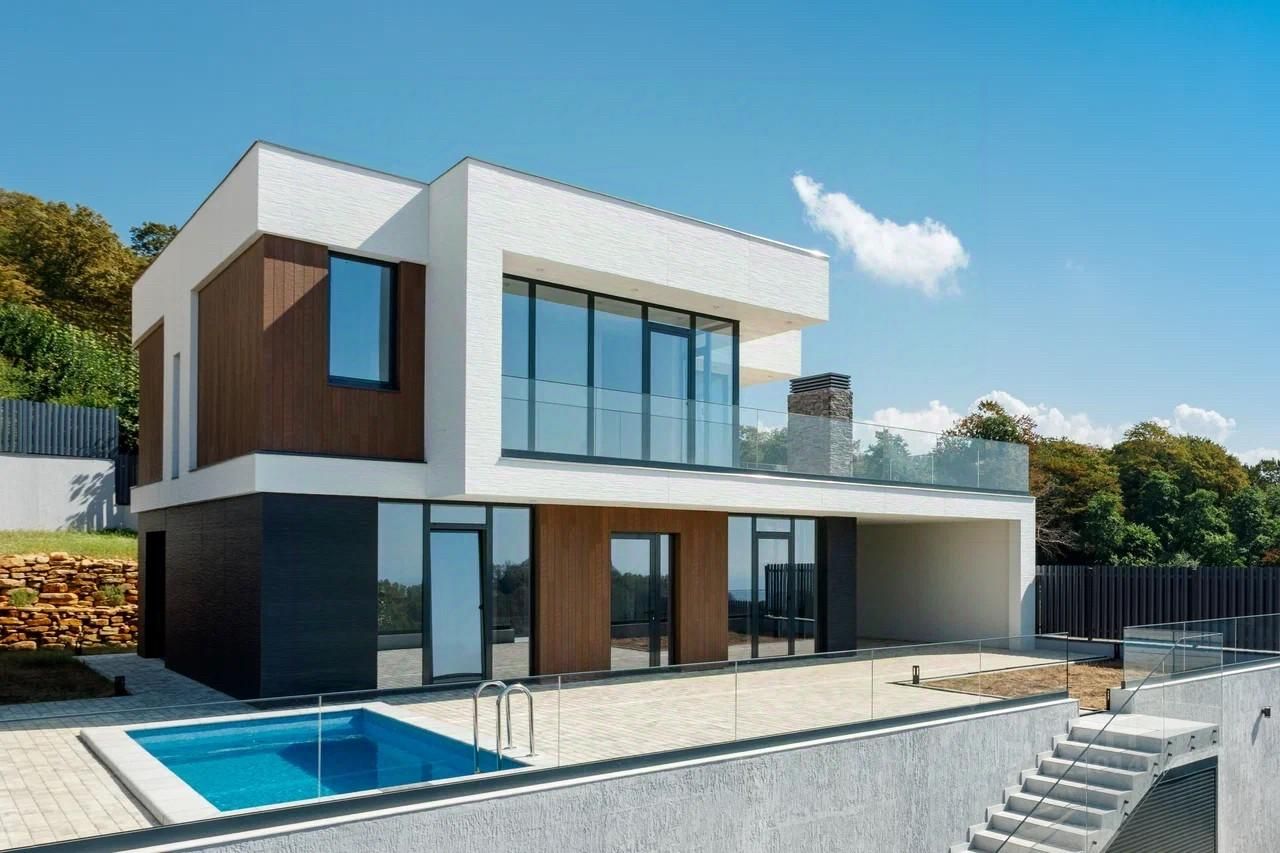- Фасады из японских фиброцементных панелей Nichiha - Алюминиевое панорамное остекление — Индивидуальный бассейн у каждой виллы — Плодовый сад и эксплуатируемая кровля