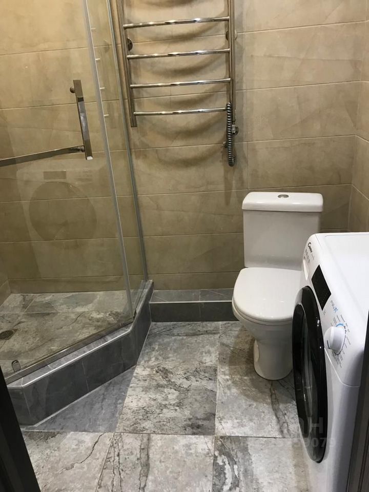 Санузел с тёплым полом, оснащен раковиной с тумбой и зеркалом, душевой кабиной, электросушилкой, унитазом и стиральной машиной.