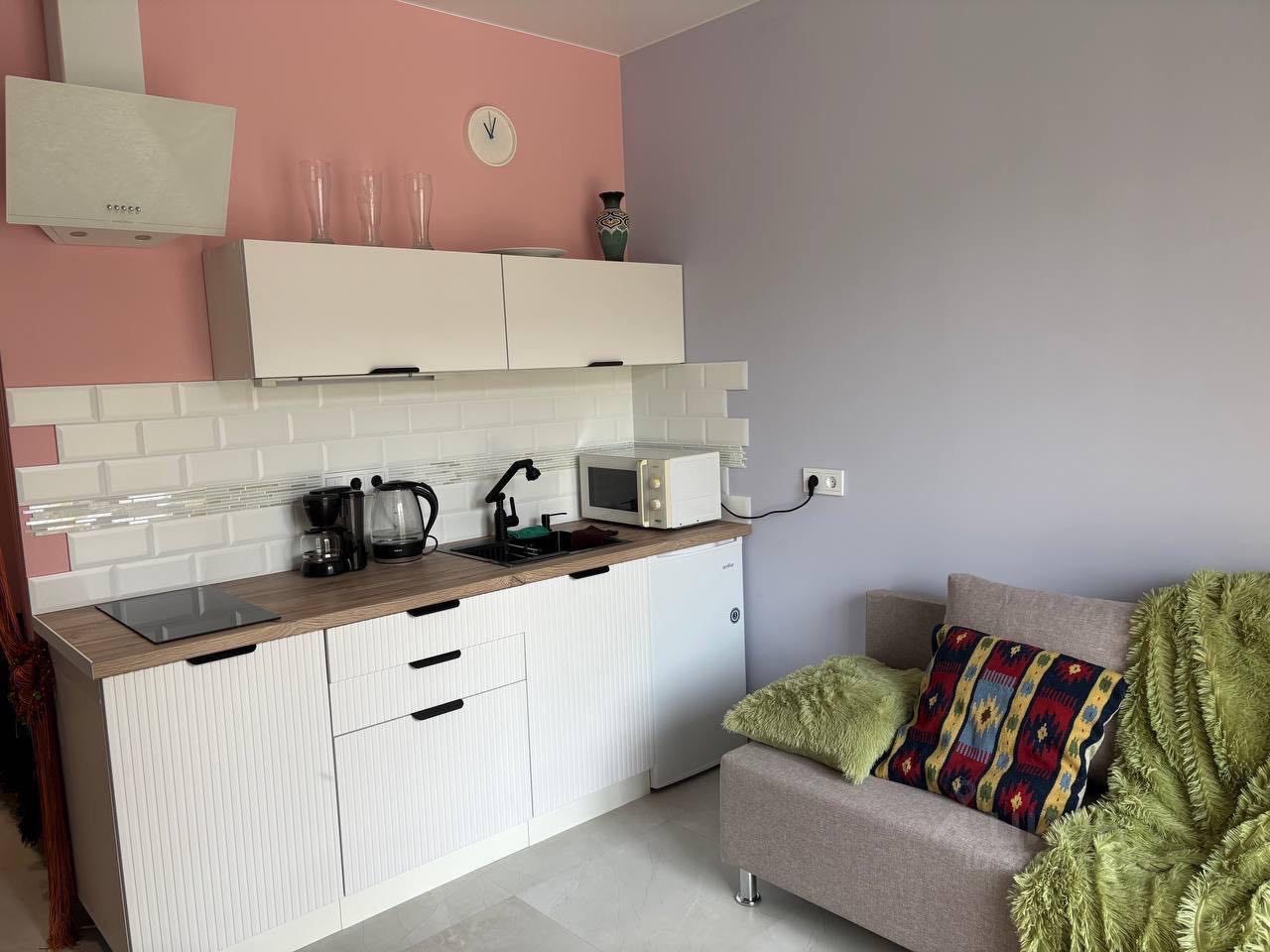 Гостиная зона представлена уютным диваном с мягкими подушками и пледом, что создает атмосферу уюта и тепла. Интерьер квартиры выполнен в светлых тонах, что визуально увеличивает пространство и делает его более светлым и воздушным.