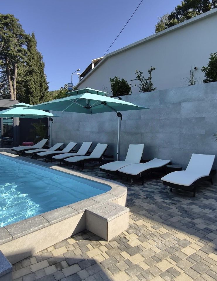 ** Ключевые преимущества:** - **Шикарный вид на море** из всех номеров. - **Подогреваемый бассейн** с лаунж-зоной и барбекю. - **Охраняемая территория** с видеонаблюдением. - **Кафе** на 35 посадочных мест. - **Удобная транспортная доступность** и комфортный автомобильный заезд.