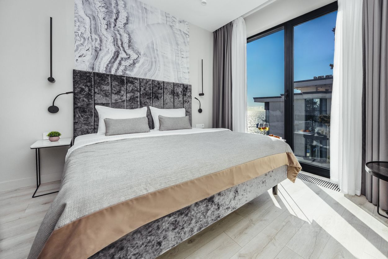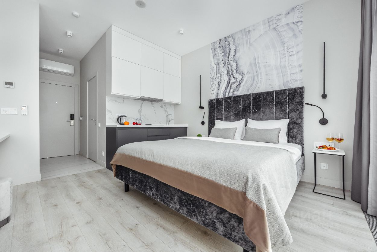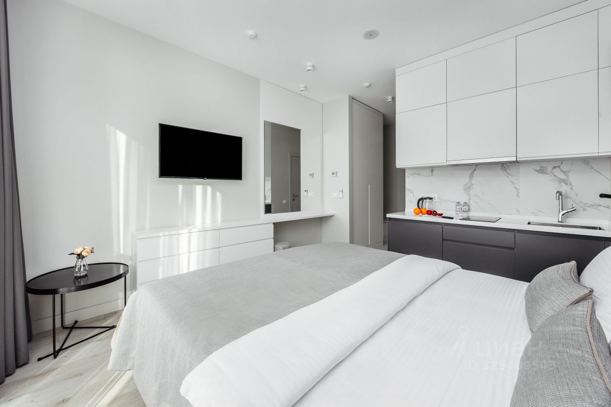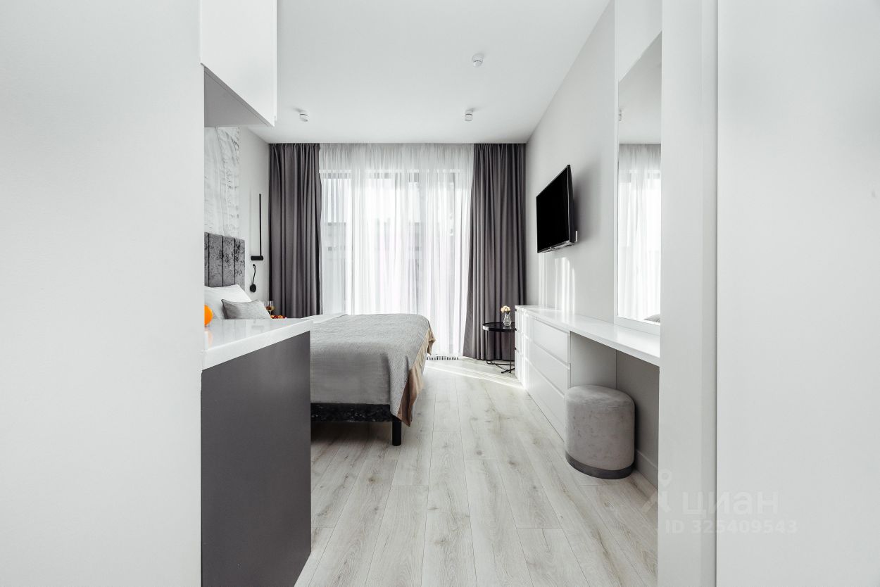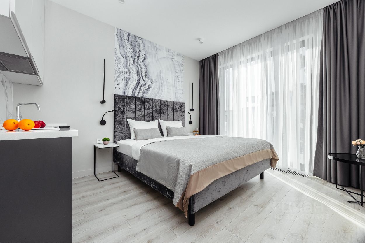 Студии: Наши студии полностью укомплектованы для вашего комфорта. Вы сможете воспользоваться полностью оборудованной кухней, мягкой мебелью и белоснежным постельным бельем. Современная система кондиционирования и внутрипольное отопление обеспечат вам уют в любое время года. В студии вас будут ожидать фен, утюг, гладильная доска, пылесос и косметический набор. Идеальный вариант для двух человек: вас ждет удобная кровать размера ''queen size'' (180 см x 200 см). Заезд и выезд возможен круглосуточно, что позволяет вам гибко планировать свое время отдыха.