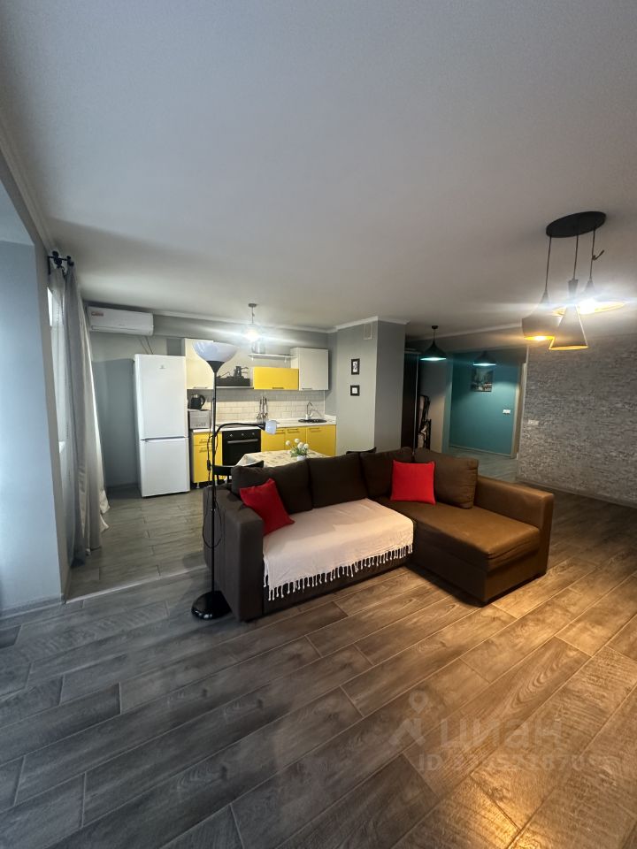 Сдаётся просторная двухкомнатная квартира в Сочи на Урожайной улице. Общая площадь — 77 квадратных метров, жилая — 54 кв. м, кухня — 12 кв. м. Квартира расположена на 5 этаже 10-этажного дома, построенного в 2015 году. Высота потолков — 2.7 метра. Из окон открывается вид как на улицу, так и во двор.