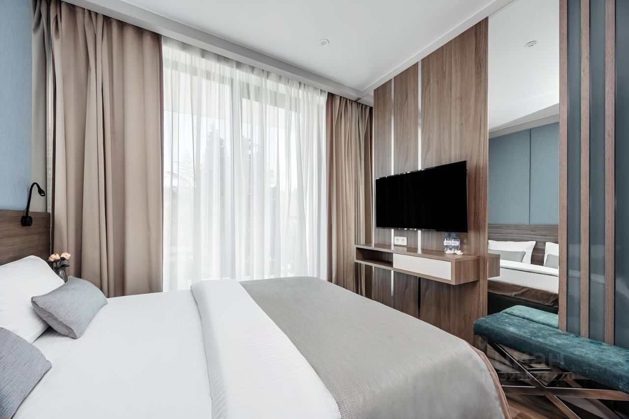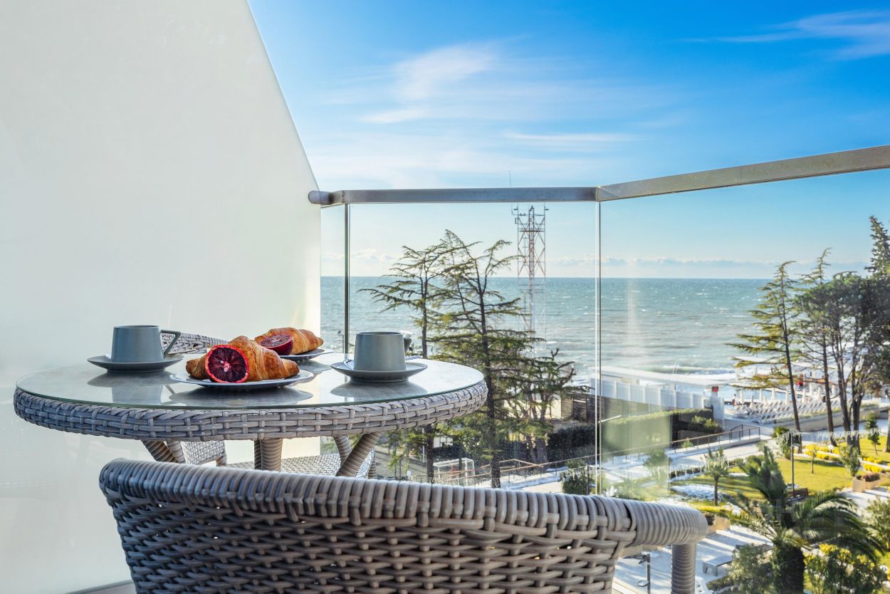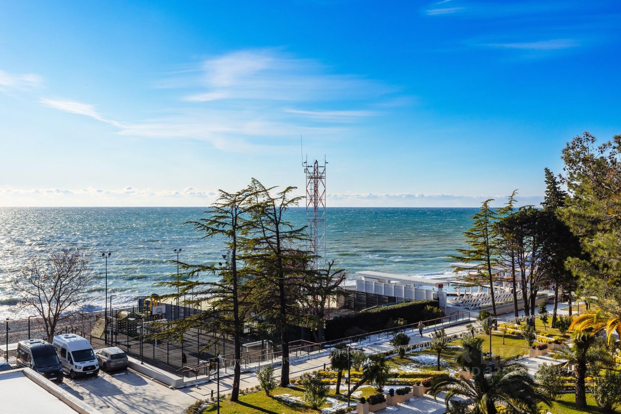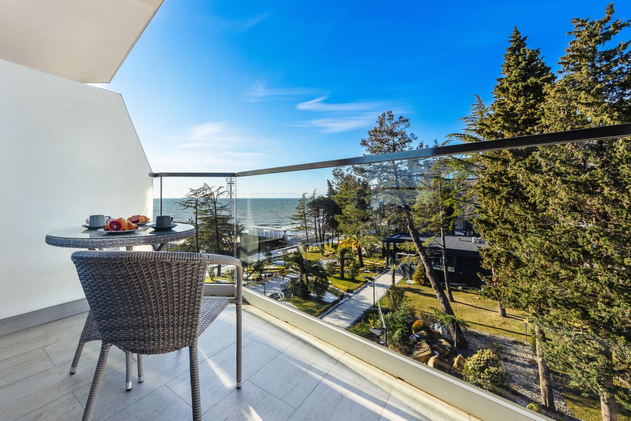 Прекрасный апартамент с новым дизайнерским ремонтом, большим балконом и прекрасным видом на море и парковую зону в аренду для двух гостей, в апарт-комплексе ''Лучезарный 4*'', в 25 метрах от моря.