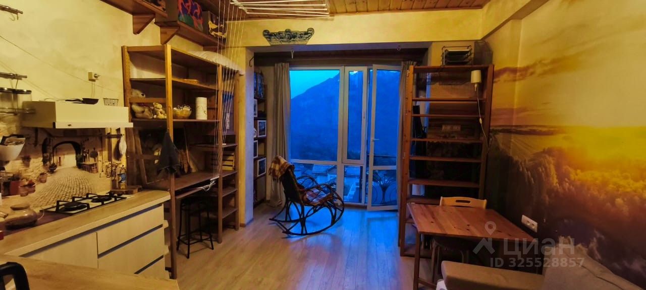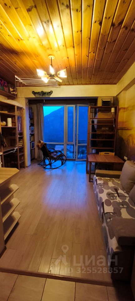 Квартира-студия, разделенная на два этажа. Дополнительные 8 кв.м. пространства под спальное место или хранение. Одна из стен - это окно в пол, обращена на гору Аибга, очень красивый вид! Ремонту 7 лет, вся мебель новая, есть кухня, зона для отдыха, спальня наверху. Очень высокие потолки, при желании, можно сделать второй уровень.