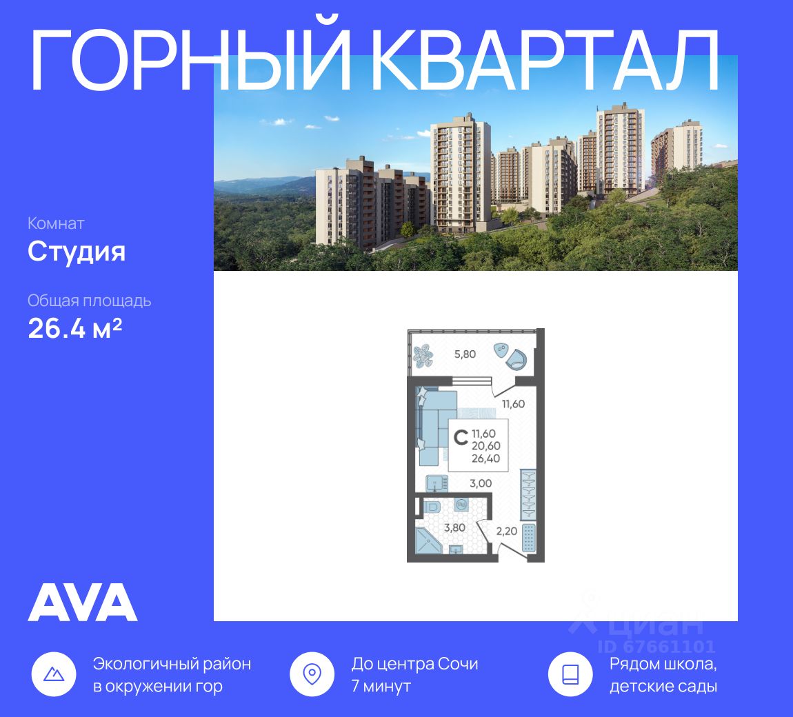 Продается студия в доме (Литер 4), срок сдачи : 3 кв. 2026, общей площадью 26.4 кв.м., на 13 этаже в новом современном жилом комплексе в Сочи ''Горный квартал'', Хостинский район. Отличный вариант для инвестиций и жизни.