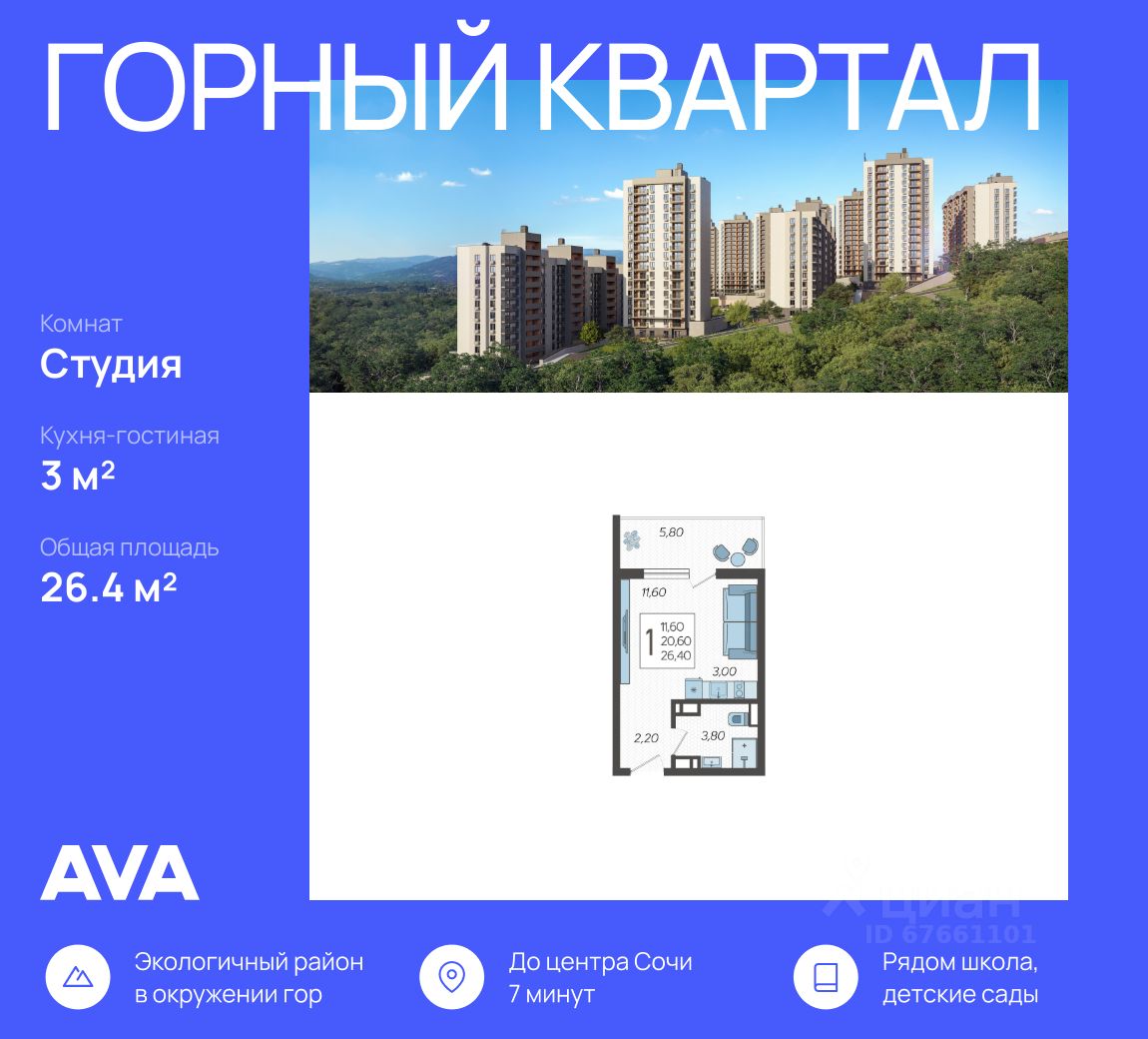 Продается студия в доме (Литер 3), срок сдачи : 3 кв. 2026, общей площадью 26.4 кв.м., на 8 этаже в новом современном жилом комплексе в Сочи ''Горный квартал'', Хостинский район. Отличный вариант для инвестиций и жизни.