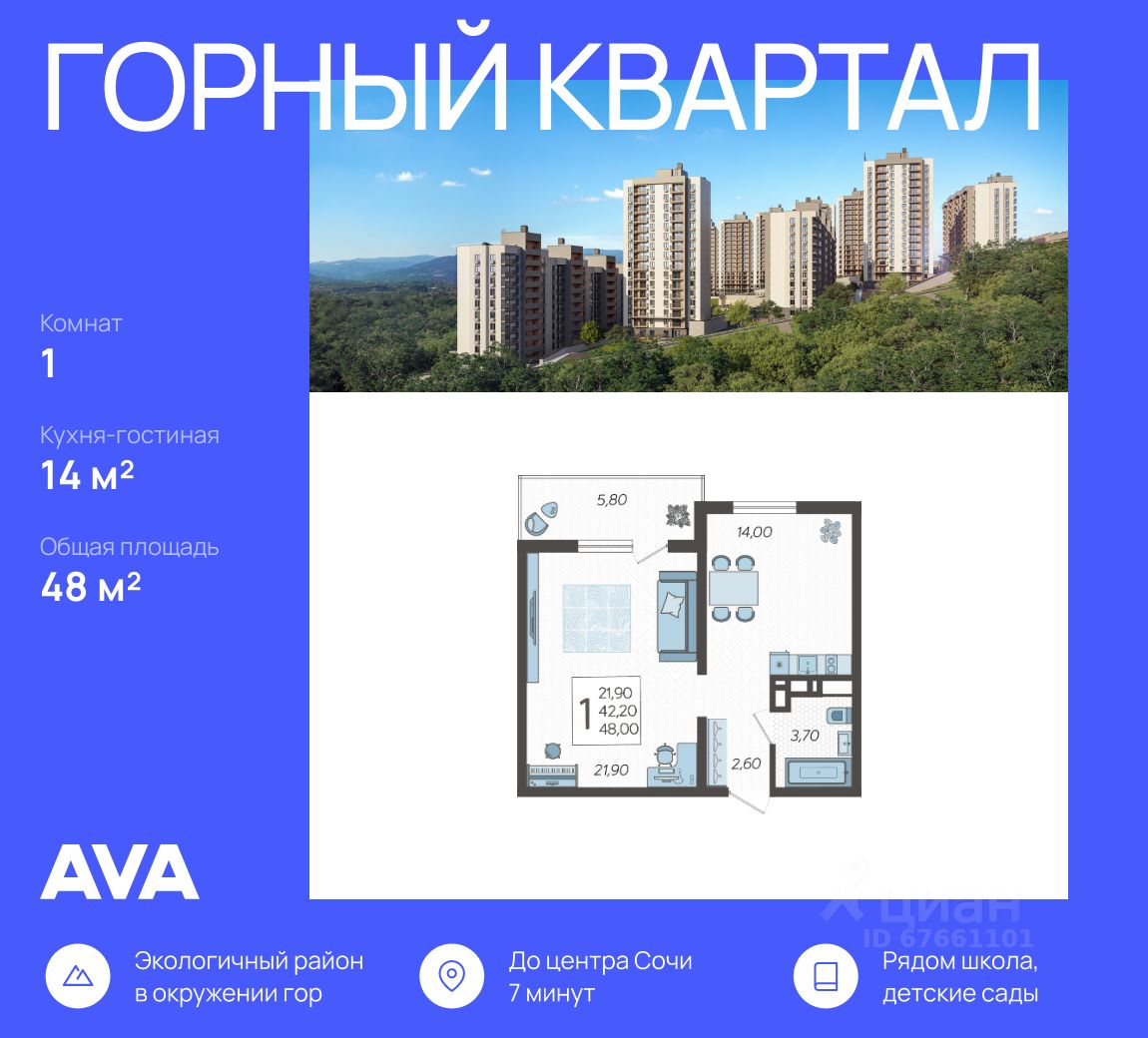Продается 1-комнатная квартира в доме (Литер 6), срок сдачи : 3 кв. 2026, общей площадью 48 кв.м., на 14 этаже в новом современном жилом комплексе в Сочи ''Горный квартал'', Хостинский район. Отличный вариант для инвестиций и жизни.