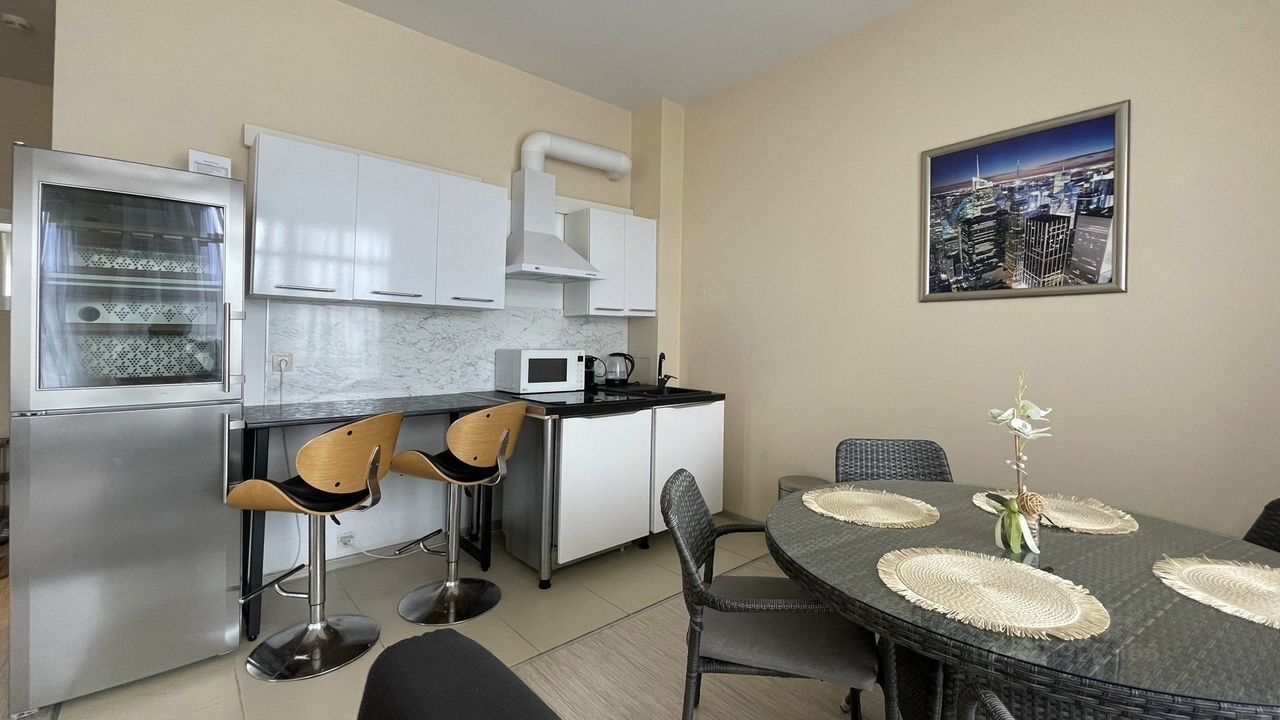 Открытые подогреваемые (!) бассейны на закрытой территории доступны и работают! Имеется бойлер, отключение горячей воды вам не помешает! В апартаментах имеется всё для комфортного проживания. Просторная планировка позволяет разместить до 6-7 человек. Апартаменты состоят из просторной кухни-гостиной и отдельно выделенной спальни.