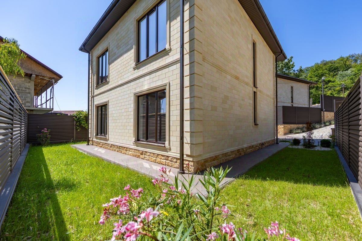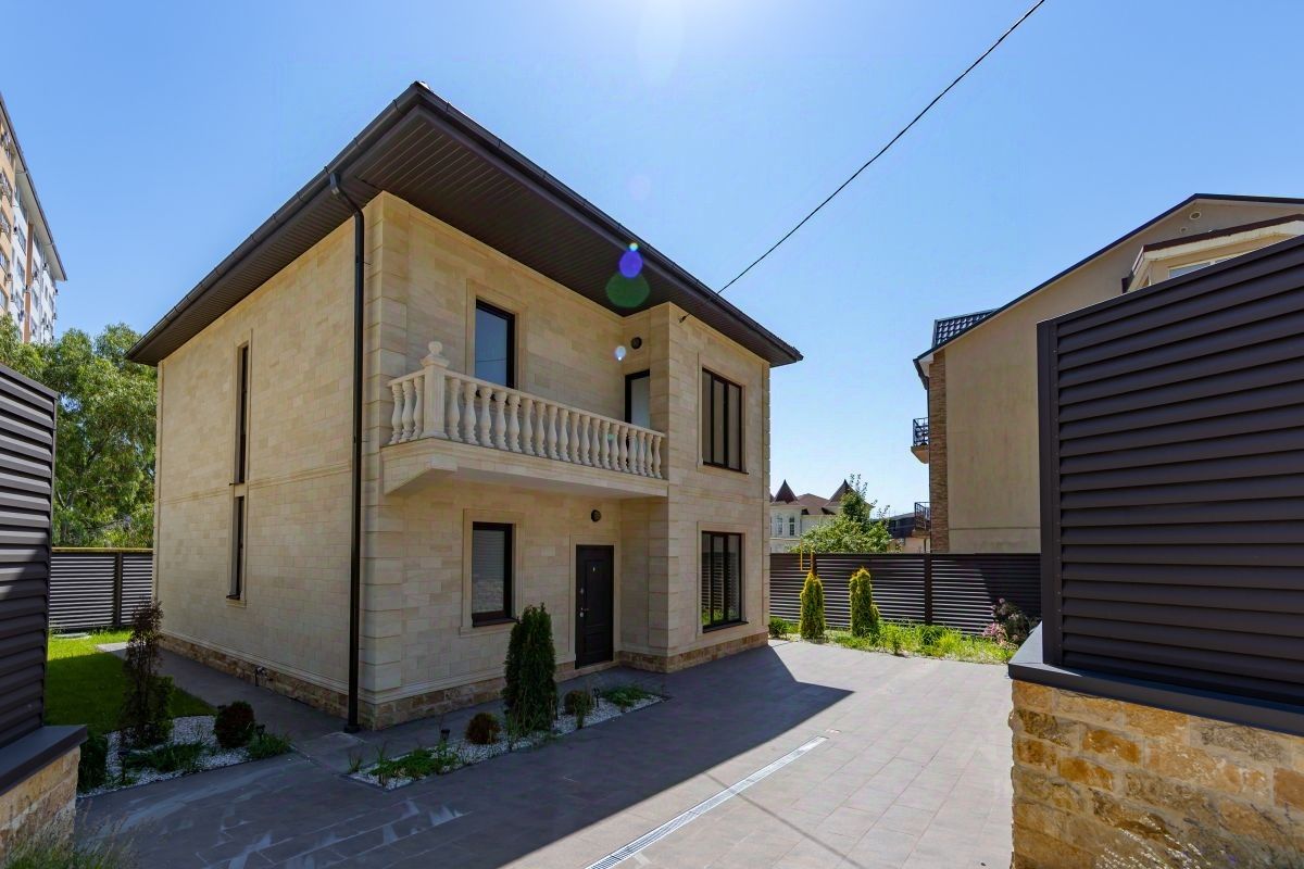 О доме и участке: - Площадь: 160 м², 2 этажа — продуманная планировка для комфортной жизни. - Пространство и свет: Высокие потолки 3 метра и панорамные окна. - Конструктив: Надежный монолитный каркас, стены из газоблока (полный блок). Строили ''как для себя''. - Фасад: Натуральный дагестанский камень — статус и долговечность.