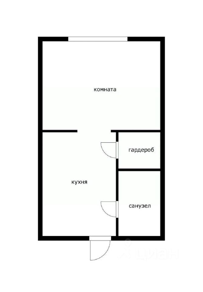 Общая площадь 18.7 метров, комната разделена на зоны: кухни, спальни, гардеробной и санузла.