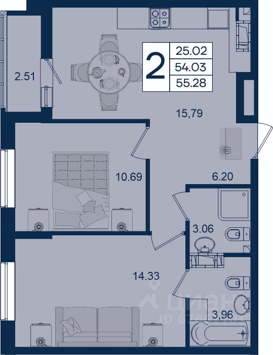 2 комнатная квартира с ремонтом 55.28 м², на 13 этаже в жилом комплексе ''Дом 101''.