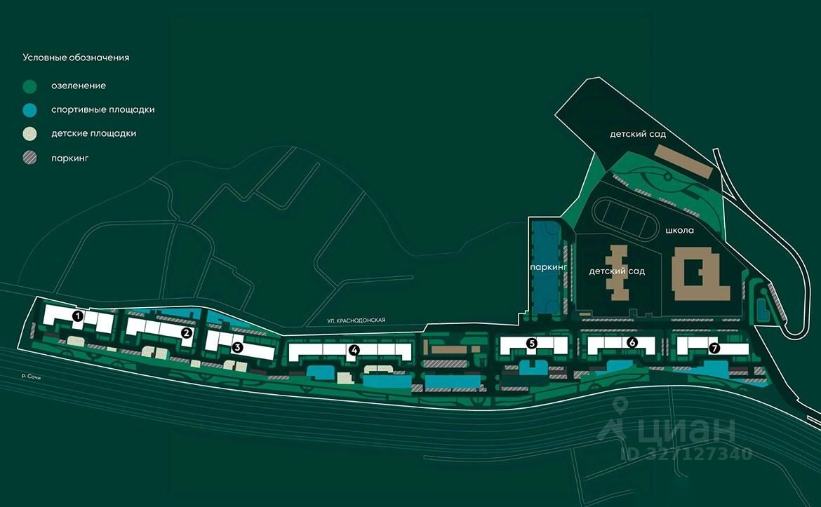 Жилой комплекс располагается в активно развивающемся Хостинском районе. В нескольких минутах ходьбы находятся поликлиники, школы, детские сады, кинотеатр, магазины и кафе. До центра Сочи можно добраться за 30 минут транспортом.