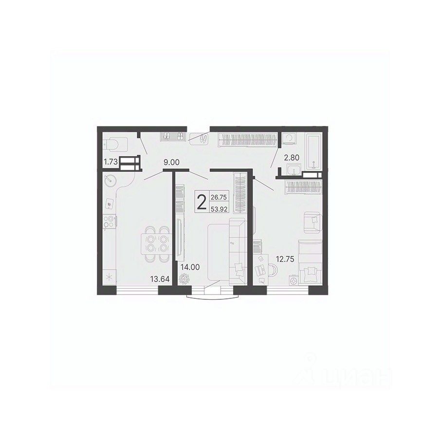 Общая площадь53,92 м2