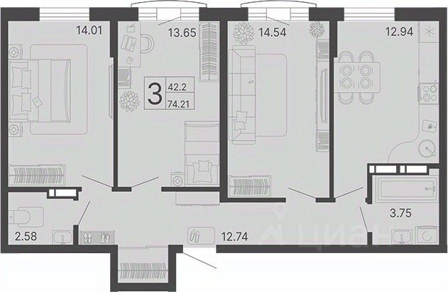 Общая площадь74,21 м2