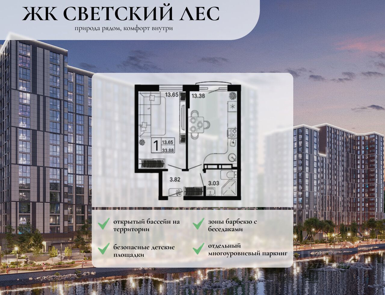 На закрытой территории комплекса выполнен ландшафтный дизайн, установлены безопасные детские площадки для детей всех возрастов, места для отдыха, зоны барбекю с беседками, спортивные площадки, установлен открытый бассейн. На территории также оборудована своя набережная протяженностью в 1,2км.