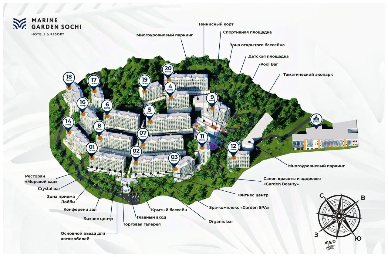 ''Marine Garden Sochi'' Hotels & Resort - крупнейший курортный комплекс, расположенный между живописным зеленым массивом и панорамным морским простором района Хоста города Сочи в уединённой парковой зоне площадью 8 га с собственной культурной и развлекательной инфраструктурой.