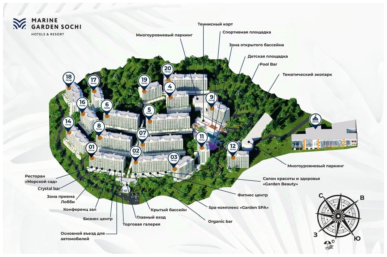 ''Marine Garden Sochi'' Hotels & Resort - крупнейший курортный комплекс, расположенный между живописным зеленым массивом и панорамным морским простором района Хоста города Сочи в уединённой парковой зоне площадью 8 га с собственной культурной и развлекательной инфраструктурой.