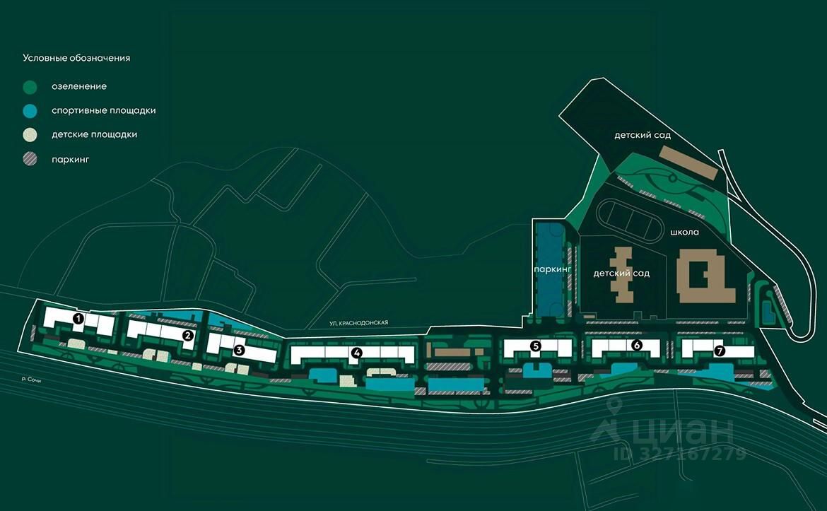 Жилой комплекс располагается в активно развивающемся Хостинском районе. В нескольких минутах ходьбы находятся поликлиники, школы, детские сады, кинотеатр, магазины и кафе. До центра Сочи можно добраться за 30 минут транспортом.