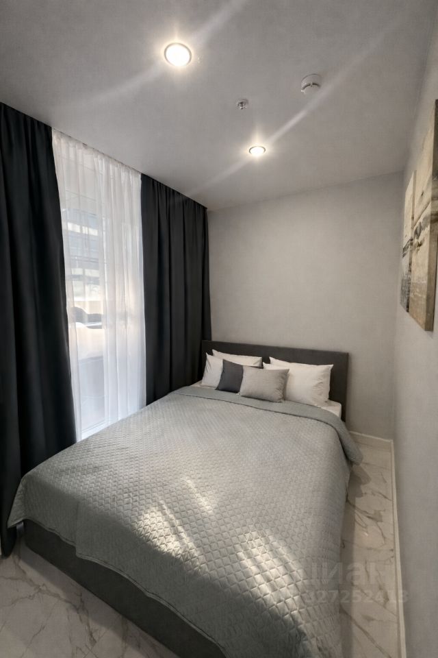 Планировка и меблировка: Помещение представляет собой совмещенное пространство кухни-гостиной и отдельную спальную зону с двухспальной кроватью. Кухня функционально пригодна для размещения всей необходимой техники.
