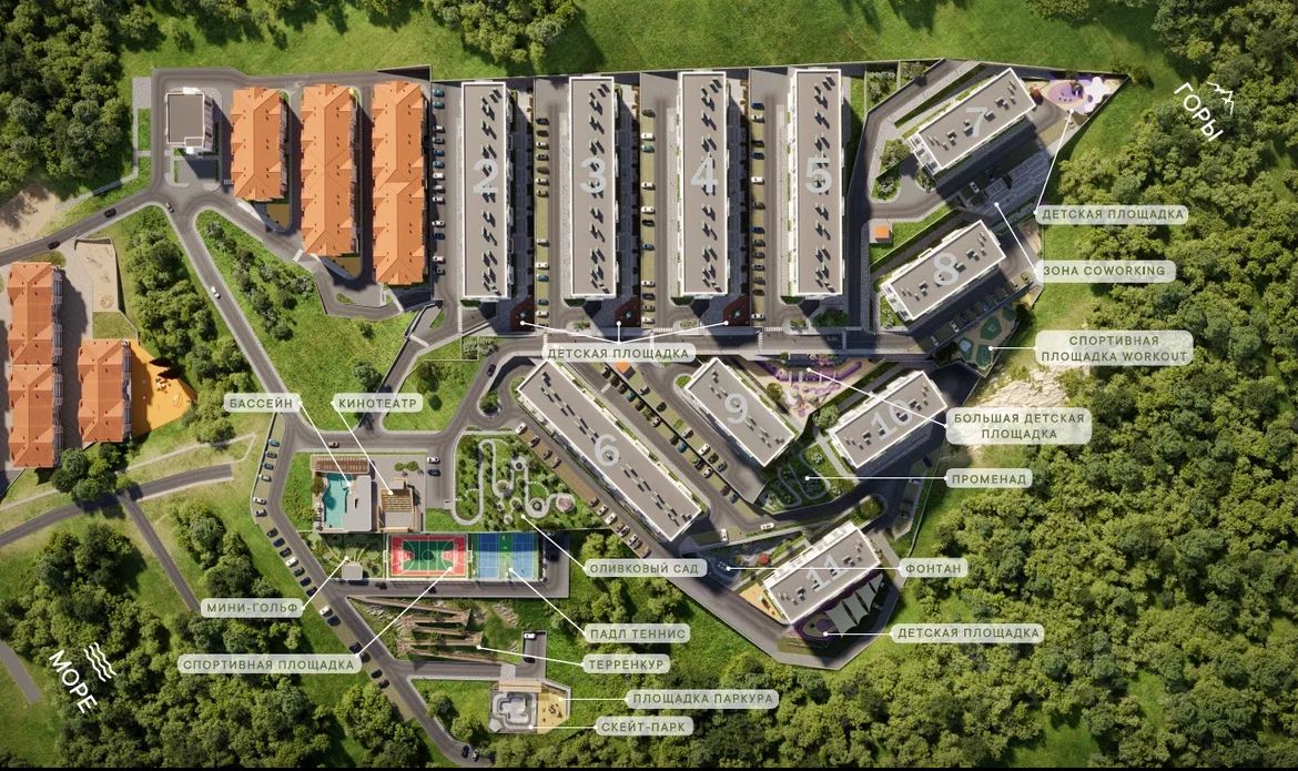Архитектура и дизайн жилого комплекса напоминают острова и побережье Средиземноморья. А еще скоро на его территории появится свой оливковый сад, где под тенью перголы можно будет наслаждаться прохладой от фонтана, или прогуляться по собственному терренкуру.