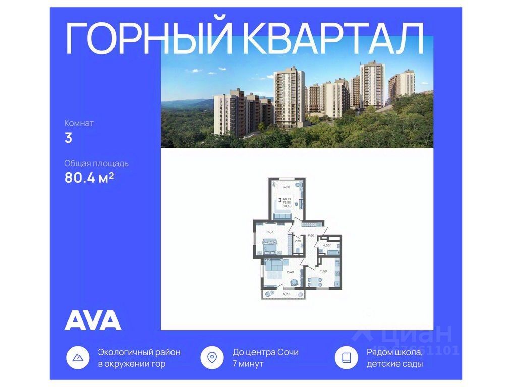 В продаже 3-комнатная квартира площадью 80.4, расположенная Литер 4 жилого комплекса комфорт+ класса ''Горный квартал''. Комплекс от девелопера AVA находится в Сочи, Хостинского района, в 15 минутах езды от центра города.