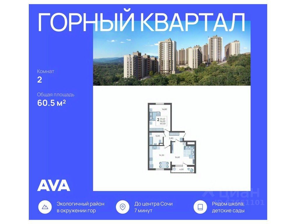 В продаже 2-комнатная квартира площадью 60.5, расположенная Литер 4 жилого комплекса комфорт+ класса ''Горный квартал''. Комплекс от девелопера AVA находится в Сочи, Хостинского района, в 15 минутах езды от центра города.