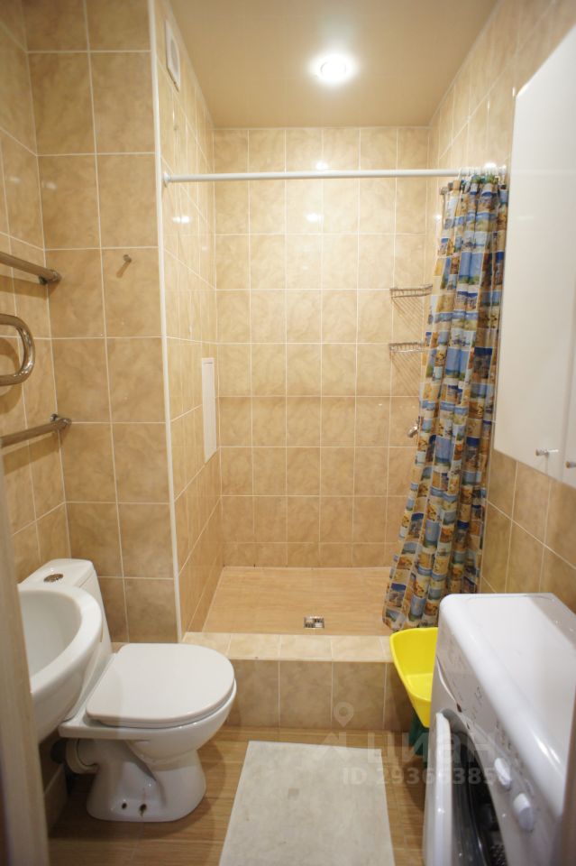 Совмещенный санузел-душевая кабинка, раковина с тумбой, зеркало, навесной шкафчик, унитаз, стиральная машинка автомат, фен для волос, коврик.